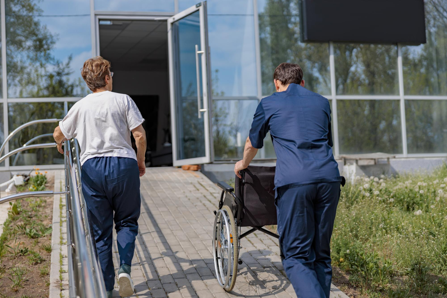 Mobility supporting individuals traveling between care facilities and recovery accommodations following same-day or short-stay procedures.